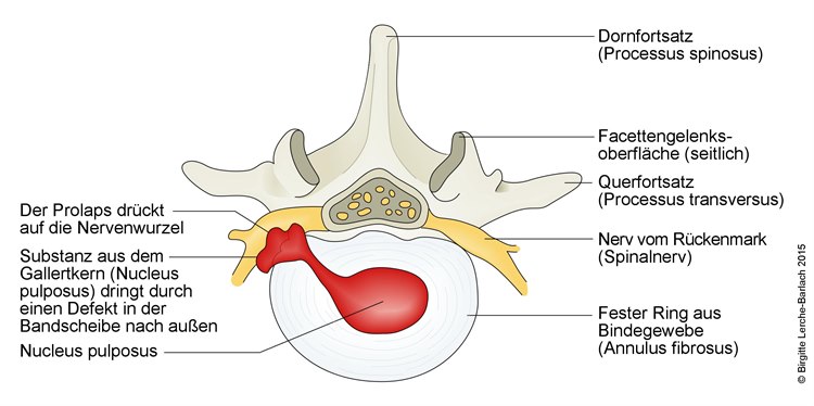 Im Laufe der Zeit sind die Bandscheiben hohen Belastungen ausgesetzt, wodurch sie sich abnutzen können. Infolge der Abnutzung kann es zu Rissen im äußeren, harten Faserring (der Schale) kommen. Den äußere harten Ring kann man sich wie den derben Gummi eines Autoreifens vorstellen, der mit der Zeit spröde wird. Durch diese Risse kann der Gallertkern nach außen gedrückt und zu einer Art Auswuchs an der Bandscheibe werden. Dies bezeichnet man als Bandscheibenvorfall. Wenn der Bandscheibenvorfall auf Nerven, Rückenmark oder Bänder drückt, kann es zu Komplikationen kommen.
