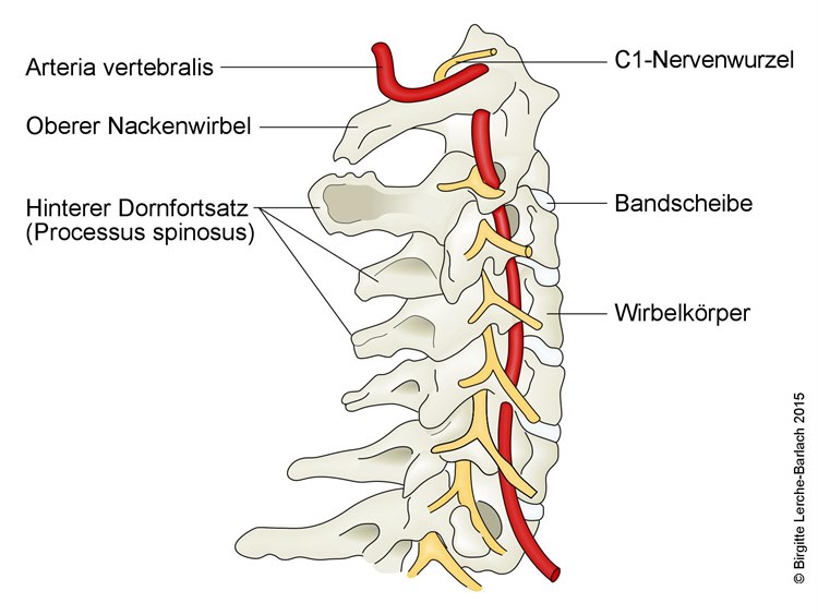 In den Zwischenwirbelräumen der Wirbelsäule treten die Nerven aus dem Rückenmark aus, die sich bis zu den verschiedenen Geweben und Organen erstrecken. Sie sorgen für den „Informationsaustausch“ zwischen Hirn und Rückenmark auf der einen und den jeweiligen Körperbereichen auf der anderen Seite. So entspringen aus dem Rückenmark im Bereich der Halswirbelsäule auf jeder Seite acht Spinalnerven – das erste Nervenpaar tritt oberhalb des 1. Halswirbels aus, die übrigen sieben aus den Zwischenwirbelräumen. Die Zervikalnerven innervieren den Hals-, Schulter- und Armbereich. Jeder Nerv ist für die Steuerung bestimmter Muskeln und für die Sensibilität in bestimmten Hautarealen verantwortlich.