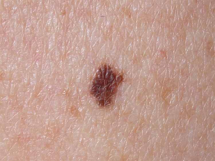 Nävus: rundes Mal mit einem Durchmesser unter 5 mm, oft mit etwas ungleichmäßiger Pigmentierung von mittelbraun bis dunkelbraun |