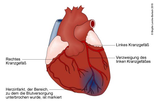 Bei einem Herzinfarkt kommt es durch einen Gefäßverschluss zu einer Unterversorgung eines Teils des Herzmuskels mit Sauerstoff. Wird das Gefäß nicht rechtzeitig wiedereröffnet, so stirbt der betroffene Teil der Herzmuskulatur ab und wird durch Bindegewebe ersetzt. Bindegewebe ist jedoch für den Herzmuskel sozusagen nutzlos, weil es nicht kontrahieren, sich also nicht zusammenziehen (pumpen) kann. In der Akutphase eines Herzinfarkts ist ein Behandlungsziel deshalb, die Durchblutung schnellstmöglich wieder herzustellen und auf diese Weise den Schaden am Herzen zu begrenzen. Die betroffene Person soll daher sofort in ein Krankenhaus gebracht werden, in dem eine sog. perkutane Koronarintervention durchgeführt werden kann, bei der das verengte Blutgefäß eröffnet wird.