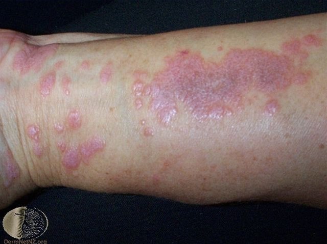 Der Ausschlag tritt insbesondere an Beugeseiten, z. B. den Handflächenseiten der Handgelenke und Unterarme, sowie am Knöchel auf.