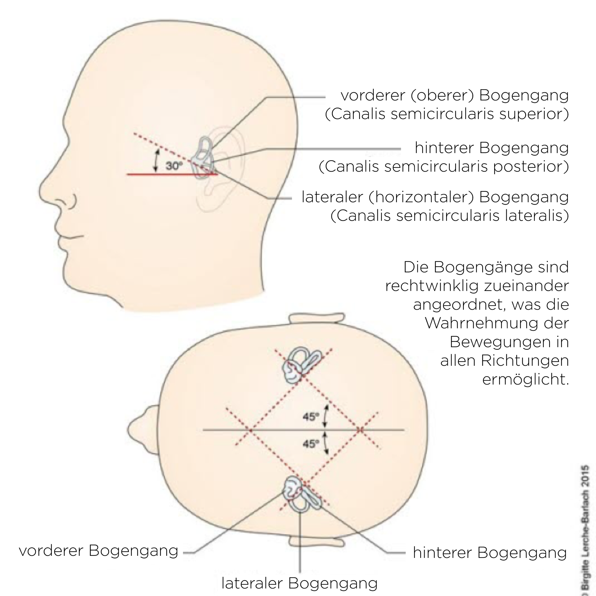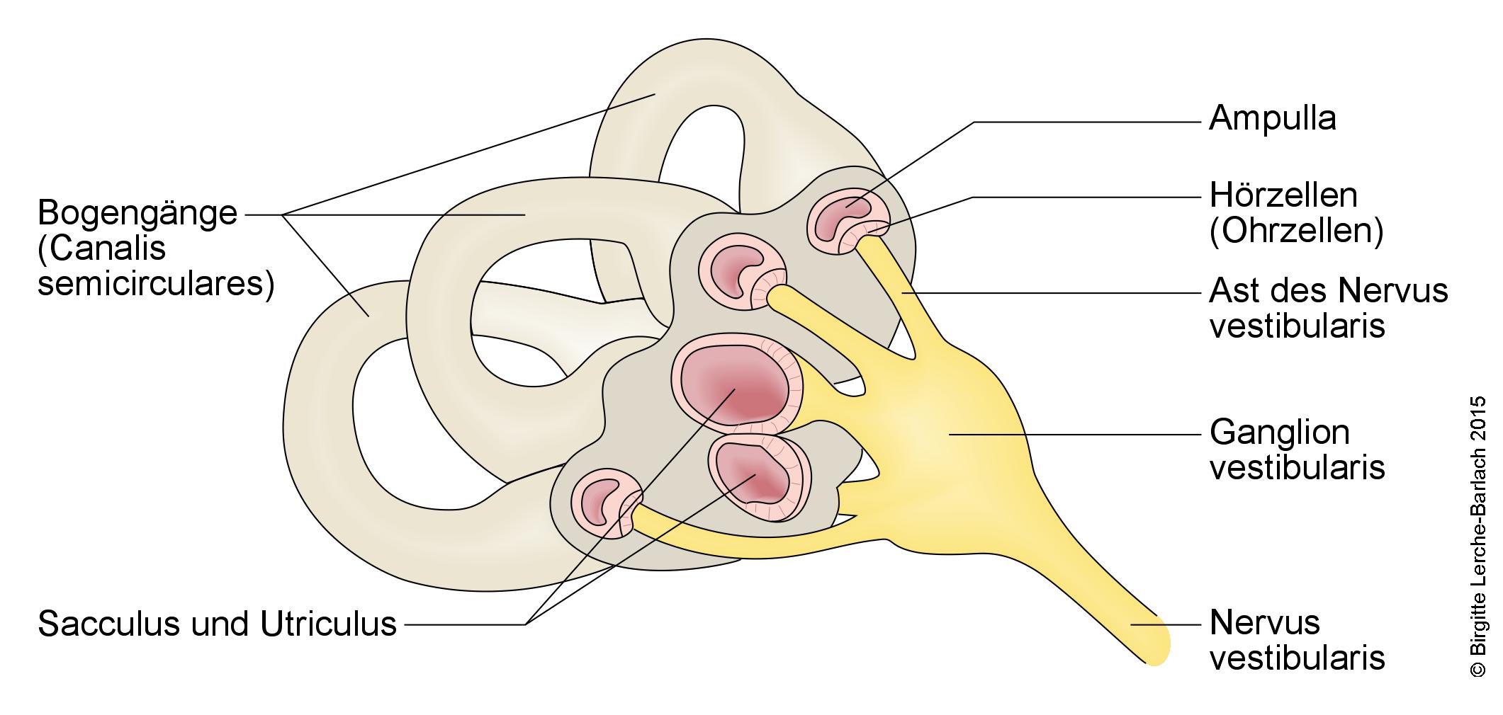Die meisten Patient*innen haben einen erhöhten Druck der Innenohrflüssigkeit. Diese Flüssigkeit wird Endolymphe genannt. Die Endolymphe füllt unter anderem die Bogengänge des Innenohrs. Es gibt drei Bogengänge – einen für jede Dimension. Wenn wir den Kopf bewegen, führt das zu einer Bewegung der Endolymphe. Diese Strömung registrieren die Sinneszellen in der Wand der Bogengänge. Die Zellen senden dann Signale über den Gleichgewichtsnerv (Nervus vestibularis) zum Gehirn. So können wir uns im Raum orientieren.