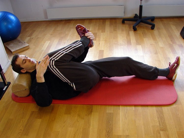 Der Piriformis-Muskel lässt sich folgendermaßen dehnen (Beispiel für die rechte Seite): Beugen Sie in Rückenlage Hüft- und Kniegelenk der rechten Seite. Die linke Hand umfasst den rechten Fußaußenrand und zieht ihn in Richtung der linken Schulter. Die rechte Hand drückt das rechte Kniegelenk nach unten rechts. Dabei sollte ein Dehnungsgefühl im seitlichen Gesäßbereich auftreten. In einer weiteren Übung wird das schmerzende Bein über das Knie des gesunden Beins gelegt und mit den Händen zum Rumpf hin gezogen. Die beiden Abbildungen oben veranschaulichen die Dehnung des Priformis-Muskels. Führen Sie am besten beide Varianten regelmäßig durch. Darüber hinaus sollten sämtliche Muskelgruppen im Bereich des Hüftgelenks gedehnt werden (auf der Vorder-, Außen- und Rückseite sowie in der Gesäßregion).