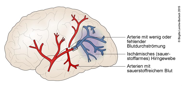 Ein Schlaganfall kann verschiedene Ursachen haben. Allgemein werden zwei Hauptmechanismen voneinander unterschieden: Der sog. Hirninfarkt (ischämischer Schlaganfall), der auf einer Mangeldurchblutung des Gehirns infolge eines Gefäßverschlusses beruht, und die Hirnblutung (hämorrhagischer Schlaganfall), die durch einen Riss in der Gefäßwand eines Hirngefäßes verursacht wird. Kommt es bei einem Blutgefäß im Gehirn zum Gefäßverschluss, so sterben infolge des Sauerstoffmangels die Hirnzellen ab, die von dem Gefäß normalerweise versorgt werden. Bei einer Hirnblutung steigt durch das austretende Blut der Druck auf die umliegenden Areale. In diesem Fall führt die Druckerhöhung zum Absterben des Hirngewebes.