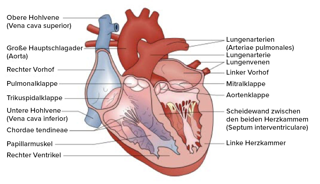Das Herz ist eine Art Pumpe, die dafür sorgt, dass der Körper mit Blut versorgt wird. Sie ist aufgebaut aus zwei Herzvorhöfen (Atrien) und zwei Herzkammern (Ventrikeln). Der Weg des Blutes kann folgendermaßen beschrieben werden: Sauerstoffarmes Blut tritt aus dem Körper über die untere und obere Hohlvene in den rechten Vorhof ein. Anschließend strömt es in die rechte Herzkammer und füllt diese. Die rechte Herzkammer pumpt das Blut aktiv über die Lungenarterien in den Lungenkreislauf. Hier wird das Blut durch kleinste Gefäße geschickt, die über eine dünne Membran Kontakt zur eingeatmeten Luft haben. Das Blut wird nun mit Sauerstoff angereichert und gibt gleichzeitig Kohlendioxid ab, das wir ausatmen. Das Blut aus dem Lungenkreislauf vereint sich nun in größeren Gefäßen und wird über die Lungenvenen in den linken Vorhof geleitet. Von hier aus wird es wiederum in die linke Herzkammer transportiert. Die linke Herzkammer pumpt das sauerstoffreiche Blut nun über die große Hauptschlagader (Aorta) in den großen Blutkreislauf (Körperkreislauf). Der Sauerstoff wird in der Peripherie des Körpers verbraucht und das sauerstoffarme Blut zum Herzen zurückgeleitet. Der Kreislauf beginnt von Neuem.