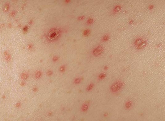 Zuerst wird die Hautveränderung fleckig-knotig. Aus jedem Fleck entsteht ein flüssigkeitsgefülltes Bläschen. Eiter kann sich bilden. Dann trocknet das Bläschen zu Schorf. So entsteht eine Kruste, die nach 7–14 Tagen abfällt – in der Regel ohne Narbenbildung. Starkes Kratzen und eine zusätzliche Infektion mit Bakterien können aber zu Narben führen.